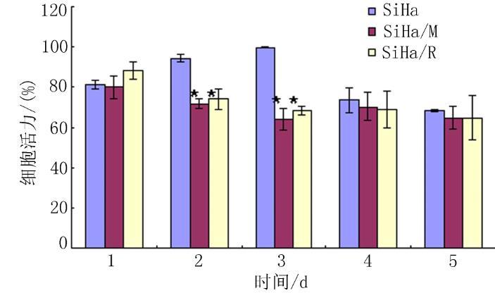 2.2mBD2對細(xì)胞活力的影響第1天SiHa/M、SiHa/R組與SiHa組比較,細(xì)胞活力差異無統(tǒng)計學(xué)意義(P=0.091);第2、3天SiHa/M、SiHa/R組細(xì)胞活力明顯高于對照組,差異有統(tǒng)計學(xué)意義(P=0.018);第4、5天3組細(xì)胞活力差異無統(tǒng)計學(xué)意義(P=0.374)(圖2)。