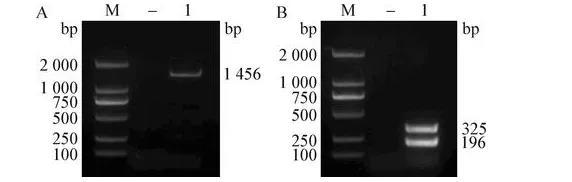 PCR產(chǎn)物凝膠電泳結(jié)果見圖3,16S rRNA PCR產(chǎn)物在約1 456 bp處出現(xiàn)條帶,測(cè)序比對(duì)結(jié)果確定其為產(chǎn)氣莢膜梭菌;毒力分型PCR產(chǎn)物在196 bp和325 bp處出現(xiàn)條帶,檢測(cè)到β和α毒素,與C型產(chǎn)氣莢膜梭菌毒素相符合,可確定菌株qinghai-12為牦牛源C型產(chǎn)氣莢膜梭菌。