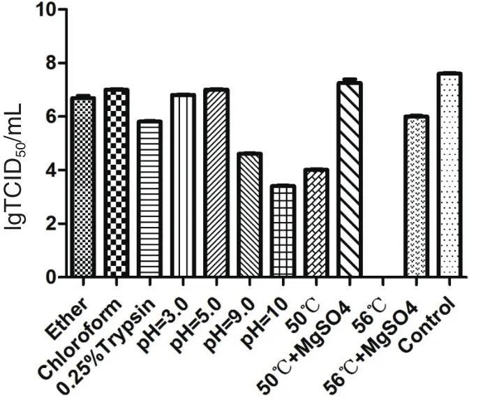 分別取2 mL病毒液,將其pH調(diào)至3.0、5.0、9.0和10.0,置于37℃水浴中作用1 h,再將pH調(diào)至7.0,過濾除菌后于MDBK細(xì)胞中測定TCID50。
