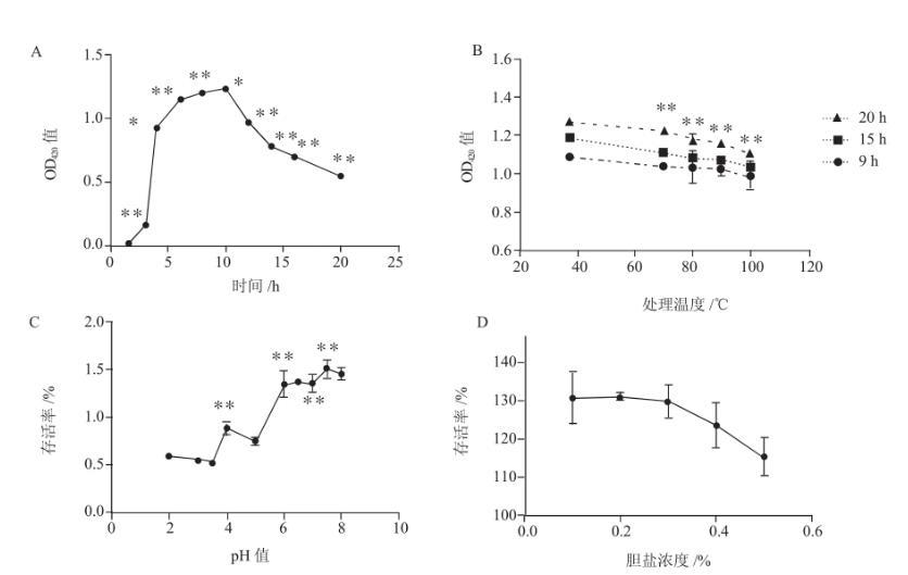 該菌株在pH值為2的培養(yǎng)基中培養(yǎng)時(shí)存活率最低,僅為59%,說(shuō)明酸性環(huán)境對(duì)其生長(zhǎng)有一定的影響。隨著培養(yǎng)液pH值的逐漸升高,存活率明顯增加。在培養(yǎng)液pH值為7.5時(shí),菌株的存活率最高,達(dá)150%(圖2-C)。說(shuō)明該菌株最適宜在中性環(huán)境中生長(zhǎng)。