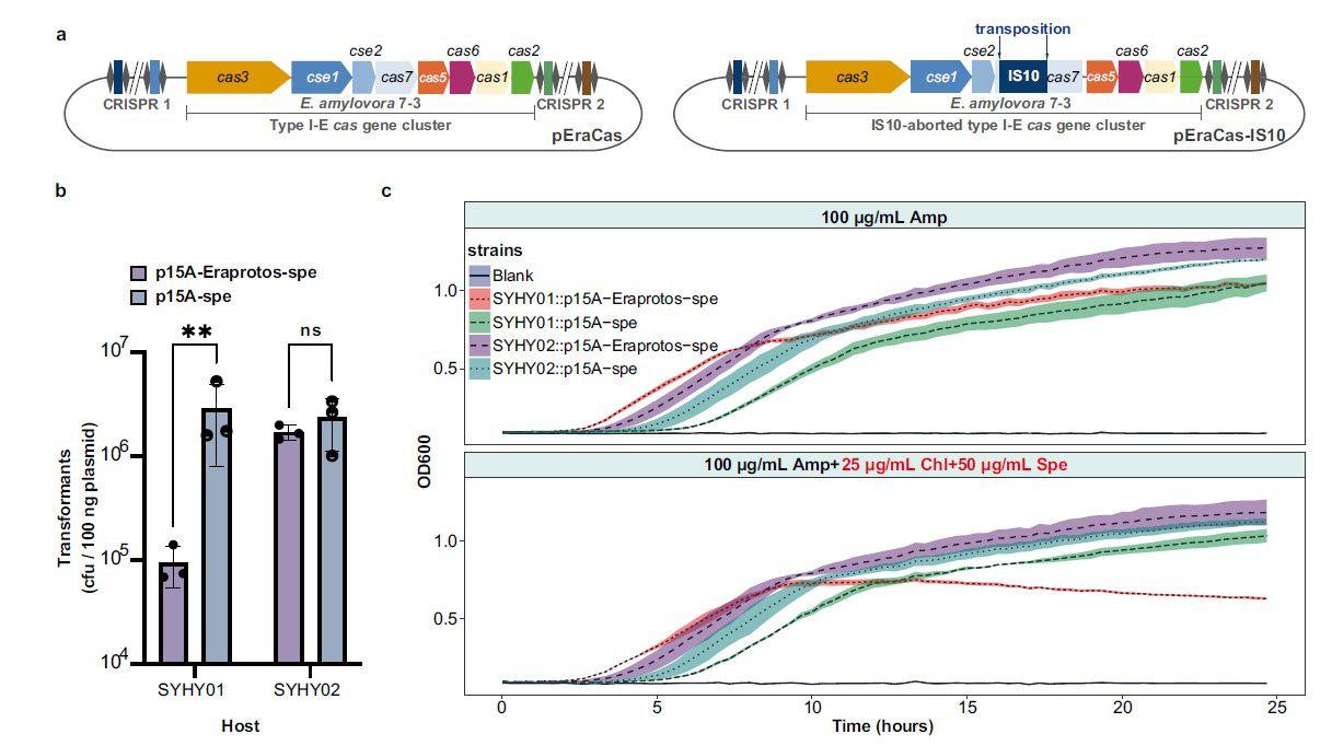 圖2、IS失活的CRISPR-Cas系統(tǒng)有助于快速獲取和提高含有可識別原始間隔區(qū)的抗生素抗性質(zhì)粒的持久性。a)E.amylovora 7-3的工程型I-E CRISPR-Cas基因座示意圖。將完整或IS10中止的CRISPR-Cas基因座分別克隆到質(zhì)粒pEraCas或pEraCas-IS10中,用于CRISPR-Cas干擾測定。b)E.amylovora 7-3型I-E CRISPR-CAS系統(tǒng)對大腸桿菌DH10B細(xì)胞的質(zhì)粒轉(zhuǎn)化干擾。通過計(jì)算每100 ng質(zhì)粒的集落形成單位(CFU)來確定轉(zhuǎn)化效率。數(shù)據(jù)顯示為來自三個生物學(xué)重復(fù)的±SD平均值;**P<0.01;ns不顯著,使用log10轉(zhuǎn)換數(shù)據(jù)的雙尾未配對t檢驗(yàn);P=0.0018,0.6150(從左到右)。源數(shù)據(jù)作為源數(shù)據(jù)文件提供。c)不同抗生素暴露下供試菌株的生長曲線。陰影區(qū)域表示3次生物學(xué)重復(fù)±S.D.的平均值。氨芐青霉素(Amp)用于維持宿主體內(nèi)的pEraCas或pEraCas-IS10,氯霉素(Chl)和壯觀霉素(Spe)用于維持p15A-Eraprotos-spe和p15A-spe。