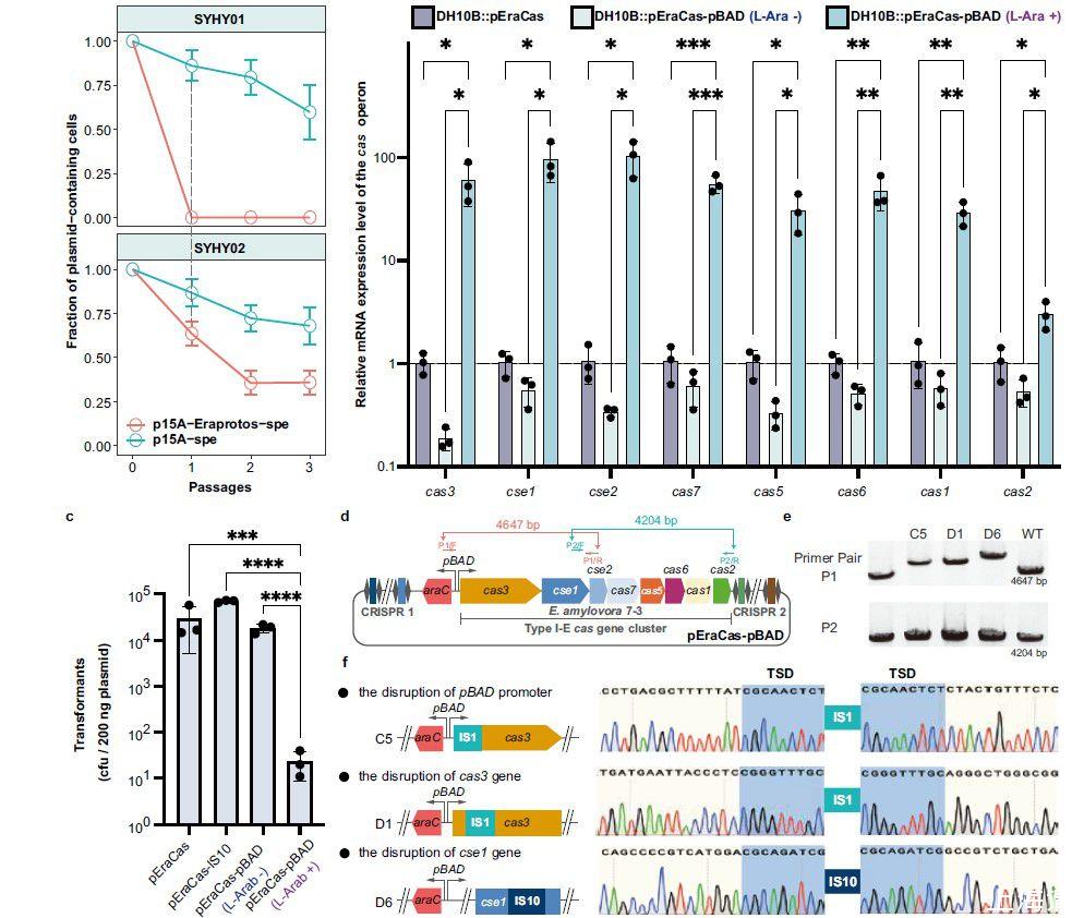 圖3、IS介導(dǎo)了在選擇壓力下獲得質(zhì)粒的好處和遺傳denfense之間的適應(yīng)性權(quán)衡。a)在SYHY01和SYHY02中轉(zhuǎn)化和傳代期間的質(zhì)粒穩(wěn)定性。b)大腸桿菌DH10B中pEraCas和pEraCas-pBAD的cas操縱子內(nèi)8個基因的相對轉(zhuǎn)錄水平。通過RT-qPCR定量基因表達(dá)并歸一化為內(nèi)源性16sRNA水平。c)通過計(jì)數(shù)每200 ng質(zhì)粒的CFU來確定pEraCas(靶向SYHY03染色體)、pEraCas-IS10(對照)和pEraCas-pBAD(在l-阿拉伯糖存在下靶向SYHY03染色體)向SYHY03的轉(zhuǎn)化效率。d)pEraCas-pBAD攜帶L-阿拉伯糖誘導(dǎo)型pBAD啟動子以驅(qū)動cas操縱子表達(dá)的示意圖。引物對P1和P2旨在擴(kuò)增pEraCas-pBAD的整個cas操縱子;顯示了預(yù)期的擴(kuò)增子大小。e使用引物對P1和P2對IS插入pEraCas-pBAD cas操縱子進(jìn)行菌落PCR篩選。泳道“WT”,用pEraCas-pBAD模板對照擴(kuò)增子;較大的PCR產(chǎn)物(泳道C5、D1和D6)提示IS轉(zhuǎn)座事件。f)通過Sanger測序確認(rèn)IS插入突變體C5、D1和D6的cas操縱子中。