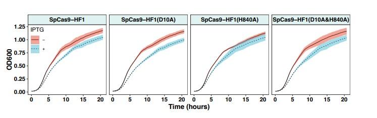 圖4、僅誘導(dǎo)Cas蛋白表達(dá)不會導(dǎo)致宿主菌株出現(xiàn)明顯的生長缺陷。在IPTG誘導(dǎo)和非誘導(dǎo)條件下,編碼不同Cas蛋白變體的菌株的生長曲線。
