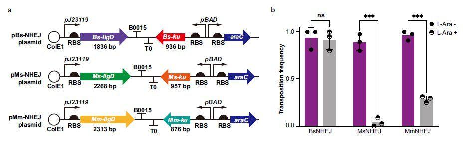 圖5、在NHEJ存在下IS轉(zhuǎn)座到cas基因中。a)示意圖顯示了三個NHEJ系統(tǒng)的組裝,其中包括參與NHEJ修復(fù)的ku和ligD基因。b)在含有ompF(由SpCas9-HF1/sgRNA介導(dǎo)的DSB靶基因)的MG1655-ΔrecA中測定轉(zhuǎn)座頻率,然后進(jìn)行易錯的NHEJ DNA修復(fù)。添加l-阿拉伯糖(10 mM)誘導(dǎo)ku表達(dá)。每個板最多隨機(jī)選擇45個存活菌落進(jìn)行PCR驗(yàn)證,并計(jì)算每種條件下IS插入SpCas9-HF1編碼區(qū)的比例。