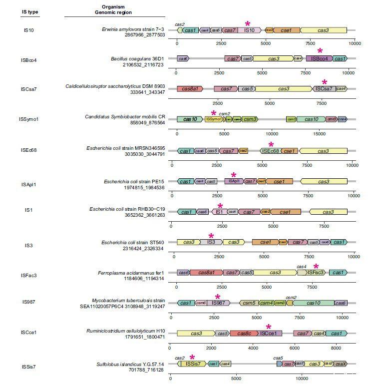 圖1、IS元件向CRISPR-Cas基因座的天然轉(zhuǎn)座。顯示了在CRISPR-Cas基因座中發(fā)現(xiàn)的每個IS元件的代表性示例。箭頭代表CRISPR-Cas簇內(nèi)的IS(用星號標(biāo)記)和基因,箭頭方向表示IS插入或基因轉(zhuǎn)錄的方向。物種名稱下方的基因組坐標(biāo)表示每個cas簇的范圍,編號線表示每個基因或IS在相應(yīng)區(qū)域內(nèi)的相對位置。