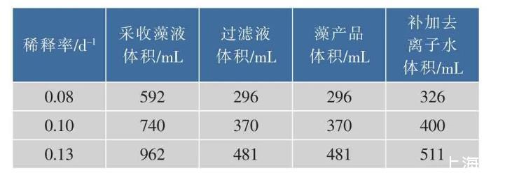 表4不同稀釋率下MPBR中每天采收藻液、獲得過濾液,藻產(chǎn)品體積和補(bǔ)加去離子水的體積