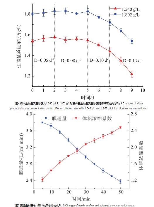 MPBR中利用膜組件對藻液進(jìn)行過濾,濃縮時,增大藻液的體積濃縮系數(shù)可提高藻產(chǎn)品生物量濃度,但體積濃縮系數(shù)太高會加重膜污染,因此需選擇合適的體積濃縮系數(shù)。藻液質(zhì)量濃度為1.855 g/L時,于過濾槽中進(jìn)行實(shí)驗(yàn),結(jié)果見圖5。隨著體積濃縮系數(shù)的增大,藻液質(zhì)量濃度變大,膜通量逐漸降低;第30分鐘時藻液體積濃縮系數(shù)達(dá)到2.082,此時膜通量由初始值3.803 L/(m2·min)下降至2.970 L/(m2·min),下降了21.92%。在膜組件使用過程中,為保持較高的膜通量水平,提高膜的使用壽命,防止膜污染加重對膜造成損壞以及增加運(yùn)行成本,在一定壓力下,當(dāng)膜通量下降20%左右時,需進(jìn)行膜清洗。因此,利用PVDF膜組件過濾,濃縮生物量質(zhì)量濃度約為1.8 g/L的藻液時,體積濃縮系數(shù)最大為2,可最大程度濃縮藻液。