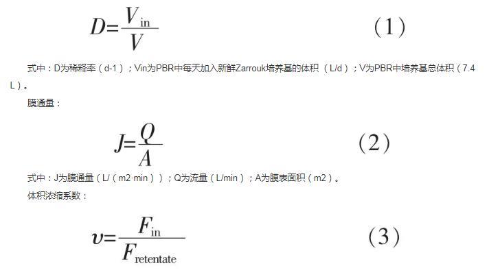 稀釋率:每天加入至反應(yīng)器中Zarrouk培養(yǎng)基的體積與反應(yīng)器中培養(yǎng)基總體積之比即為稀釋率(dilution rate,D),計(jì)算公式: