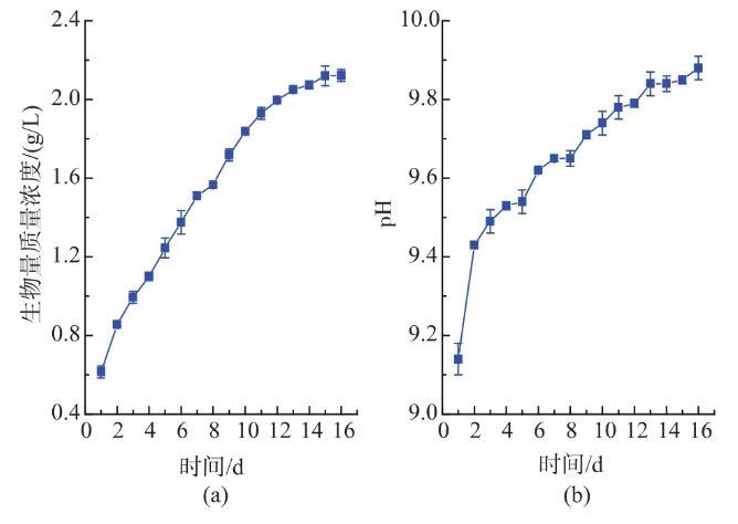 圖3鈍頂螺旋藻在PBR中生物量和pH變化