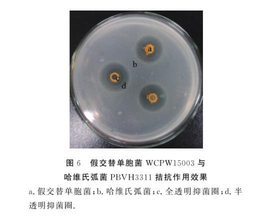 總之,只有當哈維氏弧菌PBVH3311≥103cfu/mL時,假交替單胞菌WCPW15003才會產生拮抗作用,且假交替單胞菌WCPW15003的密度應相當于或高于哈維氏弧菌PBVH3311的密度,拮抗作用大小與假交替單胞菌WCPW15003密度呈正相關性。