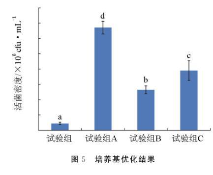 mL;試驗組C的活菌數(shù)為1.95×109cfu/mL。與對照組相比,3個試驗組的菌懸液密度均極顯著高于對照組(P<0.01);盡管試驗組B和試驗組C間僅達到顯著性差異(P<0.05),但試驗組A與試驗組B或試驗組C間均達到了極顯著差異(P<0.01)。