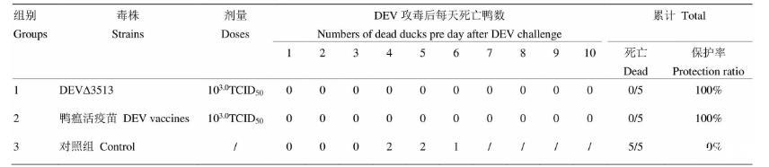 重組病毒DEVΔ3513以103.0TCID50/只、104.0TCID50/只劑量,免疫麻鴨后14 d,均能100%抵抗DEV強(qiáng)毒攻擊(表2),表明UL56基因下游3 513 bp缺失后仍具有良好免疫原性。