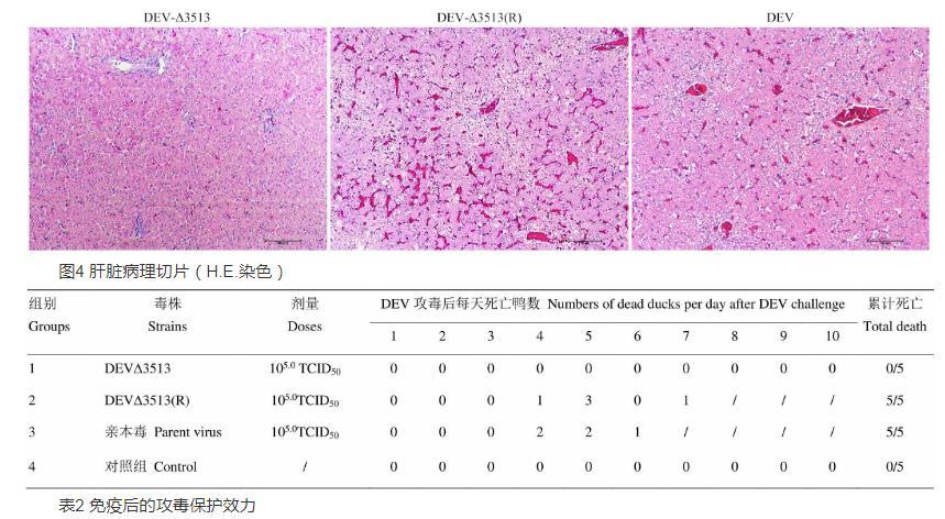 DEV親本毒、重組病毒DEV-Δ3513(R)在接種后3日麻鴨開始出現(xiàn)精神沉郁狀;7日全部死亡,剖檢肝臟表面有大量散在的白色壞死點(diǎn)。病理組織學(xué)觀察可見:靜脈和肝血竇淤血,充滿大量紅細(xì)胞;肝細(xì)胞內(nèi)有大量脂滴呈空泡狀,發(fā)生脂肪變性;部分區(qū)域出現(xiàn)局灶性肝細(xì)胞壞死,在壞死區(qū)域伴有炎性細(xì)胞,胞核溶解,與其他研究結(jié)果一致。而DEV-Δ3513接種鴨和對照鴨在14 d觀察期內(nèi),未出現(xiàn)任何臨床癥狀和死亡。病理組織學(xué)診斷可見肝臟組織結(jié)構(gòu)清晰,肝細(xì)胞形態(tài)正常,未見明顯病理變化。說明UL56基因下游3 513 bp缺失后毒力明顯減弱。