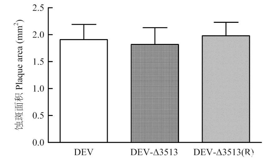 重組病毒及其親本毒均能在DEF細(xì)胞中形成清晰蝕斑;親本毒、DEV-Δ3513、DEV-Δ3513(R)蝕斑面積分別為(1.91±0.28)mm2、(1.82±0.31)mm2、(1.98±0.25)mm2,無顯著差異(>0.05)(圖5-9),說明UL56基因下游3 513 bp缺失不影響DEV在細(xì)胞間的傳播能力。