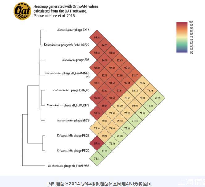 圖8噬菌體ZX14與9種相似噬菌體基因組ANI分析熱圖
