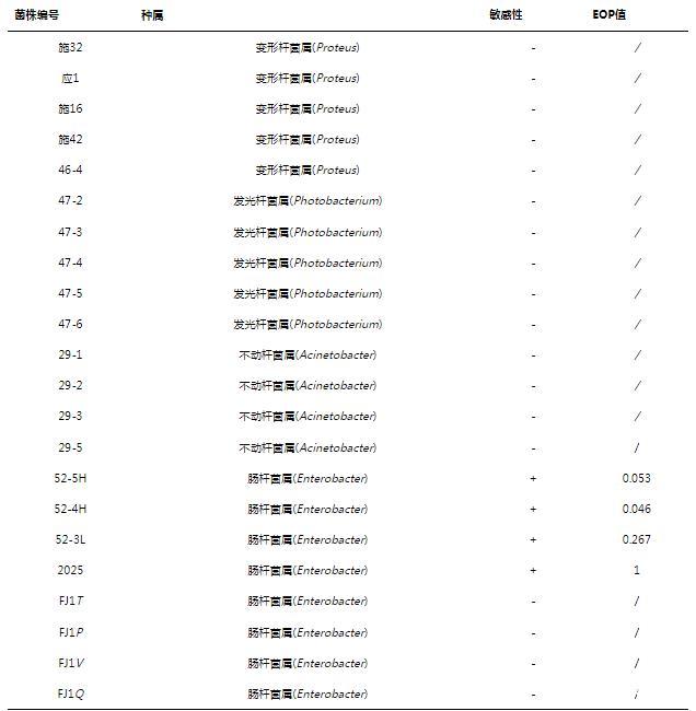 對污水中篩選出的21種桿菌進(jìn)行ZX14裂解性鑒定,結(jié)果顯示噬菌體ZX14在路德維希腸桿菌52-5H、神戶腸桿菌52-4H及陰溝腸桿菌52-3L的培養(yǎng)基平板上長出清晰噬菌斑,其余菌株的培養(yǎng)基平板未見長斑。表明噬菌體ZX14對52-5H、52-4H、52-3L具有裂解性,對其余18種桿菌無裂解性(表2)。