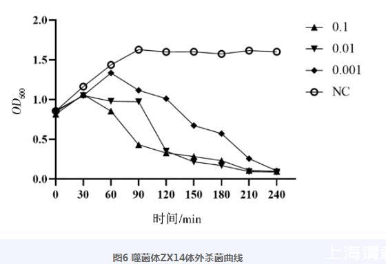如圖6所示,細(xì)菌培養(yǎng)對照組(NC)OD值于0~90 min明顯增加,90~240 min進(jìn)入平臺期,OD值在1.6僅呈現(xiàn)微小波動(dòng)。噬菌體ZX14與陰溝腸桿菌2025在不同MOI下混合,OD值先輕微增加后逐漸減少,減少速度與噬菌體數(shù)量成正比。不論噬菌體的MOI為0.1、0.01、0.001,在4 h后OD值均降在0.1左右,陰溝腸桿菌2025數(shù)量顯著減少。