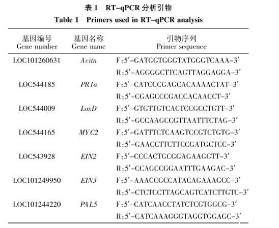 將COR處理后的番茄葉片于液氮中研磨至粉末狀,取100 mg混合均勻的樣品,采用Trizol法提取總RNA。利用反轉(zhuǎn)錄試劑盒將總RNA反轉(zhuǎn)錄得到cDNA。利用Primer 5設(shè)計7對引物(表1),測定不同處理下葉片中的PR1a、LoxD、MYC2、EIN2、EIN3和PAL5基因的相對表達量,以番茄Actin基因作為內(nèi)參基因。在CFX96實時熒光定量分析儀(Bio-Rad上海有限公司)上進行RT-qPCR反應(yīng)。反應(yīng)程序為:95℃預(yù)變性30 s,反應(yīng)循環(huán)“95℃變性5 s,60℃退火延伸30 s”,共設(shè)置40個循環(huán)。采用2-ΔΔCt法計算基因相對表達量。本次試驗設(shè)置3次生物學(xué)重復(fù)。