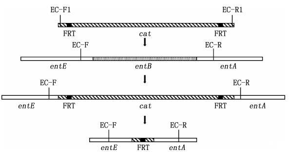 利用λRed同源重組系統(tǒng)構(gòu)建大腸桿菌entB基因缺失突變株,如圖1所示。以pKD3質(zhì)粒DNA為模板,通過(guò)引物EC-F1/R1進(jìn)行PCR擴(kuò)增獲得兩端為entB基因的同源臂序列,中間為氯霉素(Cm)抗性基因片段,擴(kuò)增產(chǎn)物用DpnⅠ進(jìn)行酶切,以消除PCR產(chǎn)物中質(zhì)粒DNA的污染,切膠回收后獲得打靶替換entB基因的抗性基因DNA,經(jīng)核酸測(cè)定儀定量后保存?zhèn)溆谩?