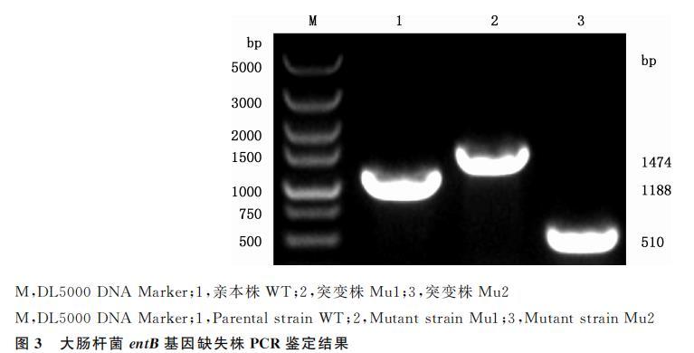 利用λRed同源重組系統(tǒng)構(gòu)建大腸桿菌entB基因缺失株Mu1和Mu2,PCR擴(kuò)增結(jié)果顯示,親本株擴(kuò)增產(chǎn)物大小為1188bp,Mu1突變株擴(kuò)增產(chǎn)物大小為1474bp,Mu2突變株擴(kuò)增產(chǎn)物大小為510bp(圖3),片段大小與預(yù)期相符。