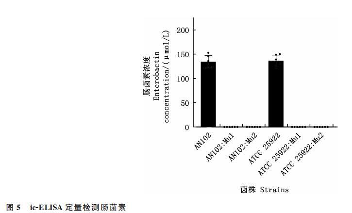 2.3 entB基因缺失株分泌腸菌素的檢測(cè)分別利用CAS試驗(yàn)和ic-ELISA方法檢測(cè)大腸桿菌親本株和突變株Mu1、Mu2分泌腸菌素的能力。CAS結(jié)果顯示,大腸桿菌AN102和ATCC25922親本株分泌腸菌素后瓊脂由藍(lán)色變?yōu)辄S色,在接種環(huán)周圍形成較大的黃色暈圈,而突變株Mu1和Mu2接種環(huán)周圍黃色暈圈較小(圖4)。ic-ELISA檢測(cè)結(jié)果顯示,大腸桿菌AN102和ATCC 25922親本株中腸菌素濃度為100~150μmol/L,而突變株Mu1和Mu2中均未檢測(cè)腸菌素(圖5)。