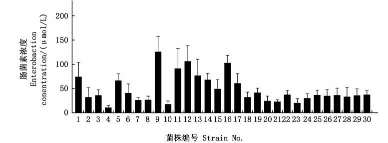 對(duì)雞腸道臨床大腸桿菌分離株分泌腸菌素的水平進(jìn)行測(cè)定,結(jié)果顯示,30株大腸桿菌分離株均可分泌不同水平的腸菌素,培養(yǎng)上清中腸菌素濃度介于11~126μmol/L之間(圖2)。