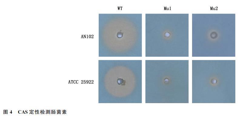 配制鉻天青S(chromeazurolS,CAS)培養(yǎng)基,用于腸菌素的定性檢測(cè)。將大腸桿菌親本株(WT)和突變株(Mu1、Mu2)分別在LB肉湯中培養(yǎng)至D600nm值為1.0,在CAS瓊脂板上打孔,每孔加入10μL菌液,置37℃培養(yǎng)24h后觀察拍照。