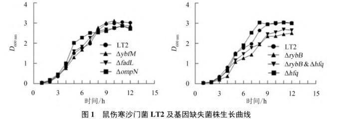 圖1鼠傷寒沙門菌LT2及基因缺失菌株生長(zhǎng)曲線