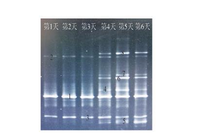 圖1調(diào)理牛排腐敗期細(xì)菌16S rDNA V6~V8區(qū)基因的PCR-DGGE指紋圖譜