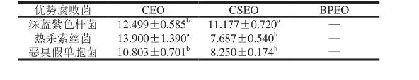表4 CEO、CSEO和PBEO對優(yōu)勢腐敗菌的抑菌圈直徑