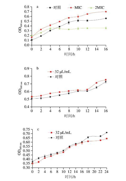 圖2 CEO對深藍(lán)紫色桿菌(a)、惡臭假單胞菌(b)、熱殺索絲菌(c)生長曲線的影響
