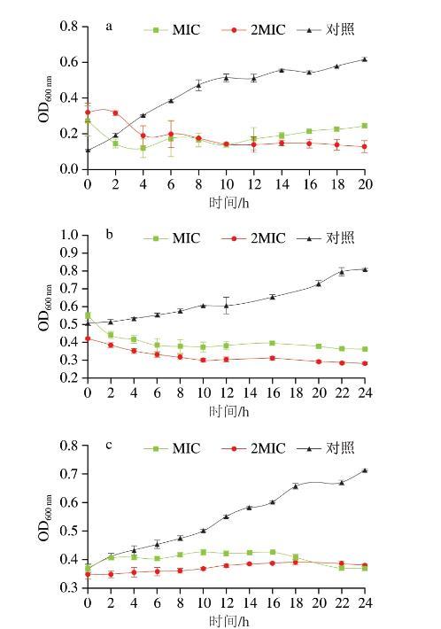 圖3 CSEO對深藍(lán)紫色桿菌(a)、惡臭假單胞菌(b)、熱殺索絲菌(c)生長曲線的影響