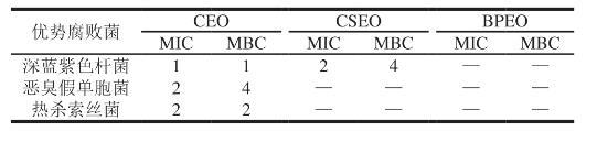 表5 CEO、CSEO、BPEO對優(yōu)勢腐敗菌的MIC和MBC