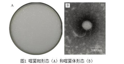 圖1噬菌斑形態(tài)(A)和噬菌體形態(tài)(B)