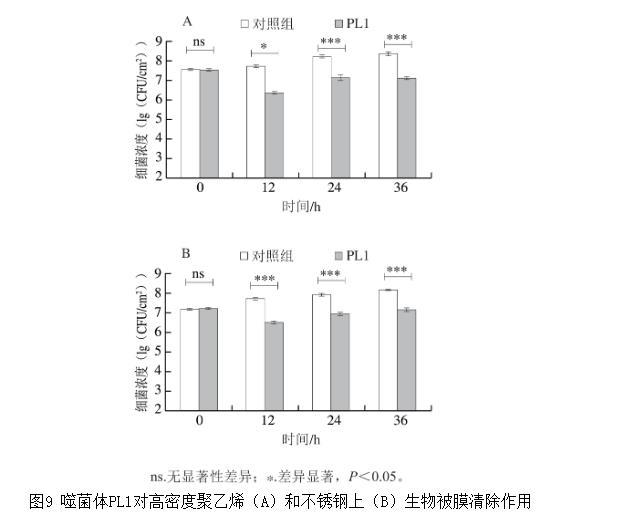圖9噬菌體PL1對高密度聚乙烯(A)和不銹鋼上(B)生物被膜清除作用