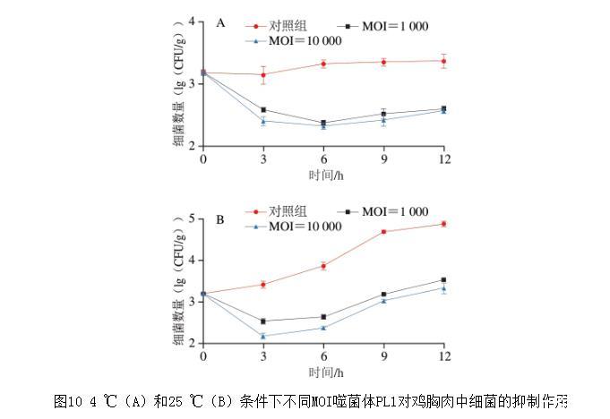 圖10 4℃(A)和25℃(B)條件下不同MOI噬菌體PL1對雞胸肉中細(xì)菌的抑制作用