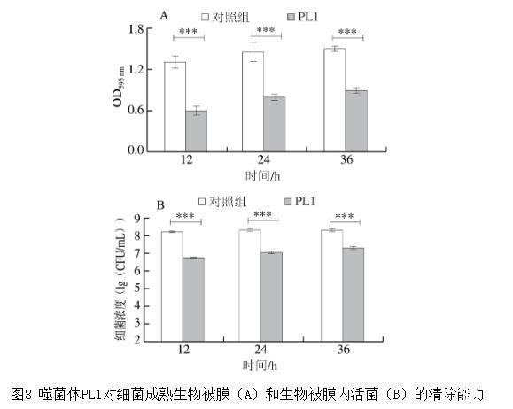 圖8噬菌體PL1對細(xì)菌成熟生物被膜(A)和生物被膜內(nèi)活菌(B)的清除能力