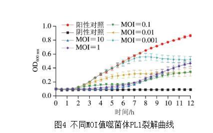 通過測定噬菌體PL1在不同MOI下的裂解活性來評價其抑菌能力。由圖4可知,在12 h內(nèi)各處理組OD600 nm值均有一定的增長,但均低于陽性對照,表明噬菌體PL1在低MOI下能抑制細(xì)菌的生長。