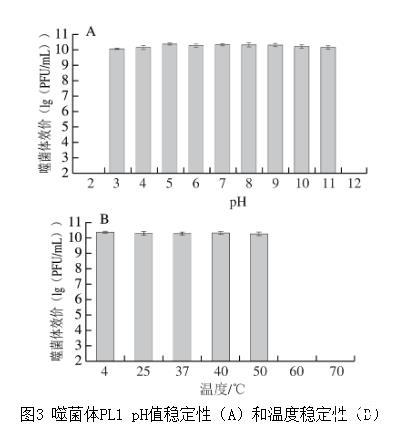 圖3噬菌體PL1 pH值穩(wěn)定性(A)和溫度穩(wěn)定性(B)