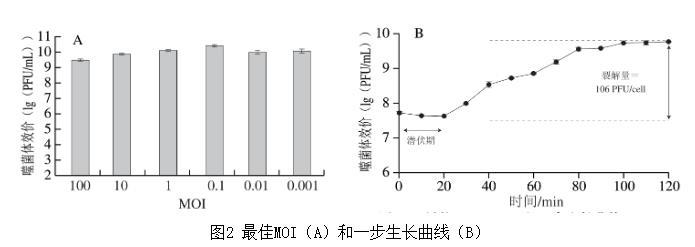 MOI和一步生長曲線是評價噬菌體裂解活性的重要指標(biāo),對指導(dǎo)噬菌體治療使用劑量或食品安全應(yīng)用具有重要意義。如圖2A所示,噬菌體PL1 MOI為0.1時,噬菌體效價最高,為10.34(lg(PFU/mL)),因此噬菌體PL1最佳MOI為0.1。按照最佳MOI繪制一步生長曲線(圖2B),由結(jié)果可知噬菌體PL1的潛伏期為20 min,裂解量為106 PFU/cell。結(jié)果表明,噬菌體PL1對細(xì)菌有著良好的裂解能力。