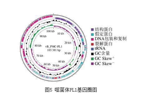 作為食品生物防治劑,噬菌體不能攜帶抗生素耐藥基因、毒力基因等有害基因。為明確噬菌體PL1可否用于食品生物防治劑,對其全基因組分析,通過測序結(jié)果可知,噬菌體PL1的全基因組全長為103 381 bp,GC相對含量為38.89%。使用RAST注釋軟件共預(yù)測了158個開放閱讀框(open reading frame,ORF),包括18個tRNA和140個其他類型的ORF,其中有63個ORF編碼的功能蛋白已被注釋。使用上述工具檢測得出噬菌體PL1不攜帶抗生素抗性基因、毒力基因和整合酶相關(guān)基因(圖5),具有良好的生物安全性。