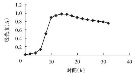 將活化好的優(yōu)選菌株,接1環(huán)至新鮮的活化培養(yǎng)基,在28℃、150 r/min恒溫振蕩培養(yǎng),在該優(yōu)選菌株的最大吸收波長處,每隔2 h取一定量培養(yǎng)液測定其OD值,以培養(yǎng)時間為橫坐標,以最大吸收波長處的OD值為縱坐標繪制生長曲線。