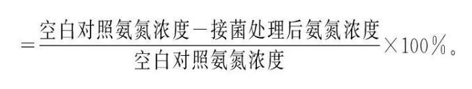 制備搖瓶篩選培養(yǎng)基190 mL加入1000 mL的三角瓶中,滅菌、冷卻后,分別接入各菌株的細胞濃度相等的菌懸液;置于150 r/min、28℃恒溫搖床中培養(yǎng)72 h;采用《水楊酸分光光度法》分析經各菌種降解后的培養(yǎng)基中的氨氮殘留量(24,48,72 h各測1次);用未接種的搖瓶做參照,記錄數據并計算氨氮降解率,并按式(1)計算菌株的氨氮降解率: