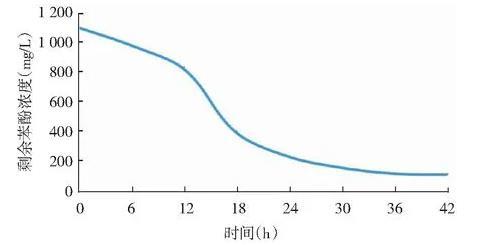每6個小時取樣培養(yǎng)液,測定剩余的苯酚濃度。以培養(yǎng)時間為橫坐標,剩余苯酚濃度為縱坐標,繪制苯酚降解曲線。如圖7所示,結(jié)果表明:培養(yǎng)時間越長,苯酚濃度越低,降解率隨之升高。培養(yǎng)到42h時,剩余苯酚濃度為104mg/L,苯酚降解率高達90.5%,說明菌株Y_1具有較強的降酚能力,達到高效降酚菌的標準。