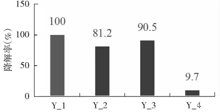 篩選出4株能以苯酚為唯一碳源生長的菌株,且對苯酚的耐受濃度均能達到1 500mg/L,分別命名為Y_1、Y_2、Y_3和Y_4。將4株菌在同一條件下培養(yǎng):苯酚濃度800 mg/L、pH 7.2、接種量4%、溫度32℃、搖床轉(zhuǎn)速180 r/min,振蕩培養(yǎng)30 h取樣測定培養(yǎng)基苯酚濃度。4株菌對苯酚的降解情況見圖1。由此可見,菌株Y_1的生長情況和降酚能力優(yōu)于其他菌株。