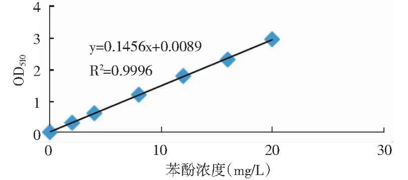 以苯酚濃度為橫坐標,以吸光度(λ=510)為縱坐標,繪制苯酚濃度標準曲線。如圖6所示。該苯酚濃度標準曲線表明,當波長等于510 nm時,苯酚濃度范圍在2~20 mg/L之間,吸光度值Y和苯酚濃度X,滿足線性方程Y=0.1456X+0.0089,R2=0.9996,表明二者呈良好的線性關系。