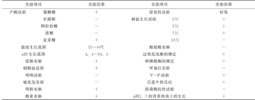 對菌株Y_1進行生理生化實驗鑒定,結(jié)果見下表。菌株可以分解葡萄糖和麥芽糖,產(chǎn)酸不產(chǎn)氣,V-P反應結(jié)果為陽性,甲基紅和吲哚實驗結(jié)果為陰性。對比《伯杰氏細菌鑒定手冊》[35]關于細菌的描述,菌株Y_1生理生化鑒定的結(jié)果基本符合芽孢桿菌的特征,再結(jié)合其形態(tài)學觀察的結(jié)果,可以初步將該菌株確定為芽孢桿菌屬(Bacillus)。