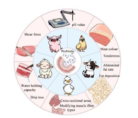 除了對(duì)肌肉功能的影響,腸道微生物還對(duì)肉質(zhì)表現(xiàn)出顯著調(diào)控作用。文章從菌群組成與功能出發(fā),探討了其對(duì)肌肉pH值、顏色、滴水損失、大理石花紋、剪切力、柔嫩度、多汁性與風(fēng)味等關(guān)鍵指標(biāo)的影響,并指出腸道微生物可通過(guò)調(diào)節(jié)肌肉纖維類型轉(zhuǎn)換和脂質(zhì)代謝,改善肉品質(zhì)。