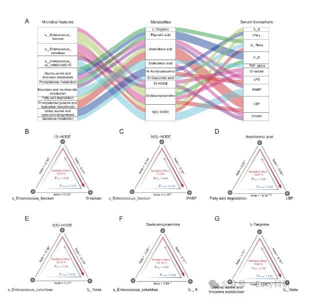 P mediation<0.05,P inverse mediation>>0.05,圖7A)。有趣的是,大多數(shù)聯(lián)系與Enterococcus faecium(四個聯(lián)系)、Enterococcus columbae(三個聯(lián)系)以及甘氨酸、絲氨酸和蘇氨酸代謝的微生物功能(三個聯(lián)系)有關(guān)。我們的中介分析表明,Enterococcus faecium可能通過降低糞便中13-HODE(26%,P mediation<0.05,圖7B)和α-二態(tài)膽酸(9(S)-HODE;17%,P mediation<0.05,圖7C)的水平來導致腸道屏障損害(以血清D-乳酸和iFABP水平升高為特征),這兩者都是LA衍生物?!?