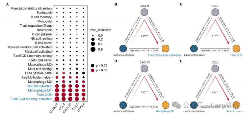 其中,作者對所有樣本進行了因果中介分析,以調(diào)查Lachnoclostridium(梭狀芽孢桿菌),趨化因子和免疫細胞之間的聯(lián)系。對于同時和梭狀芽孢桿菌顯著相關(guān)的趨化因子和免疫細胞,作者應用中介分析來評估梭狀芽孢桿菌對免疫細胞豐度的影響是否通過趨化因子介導。